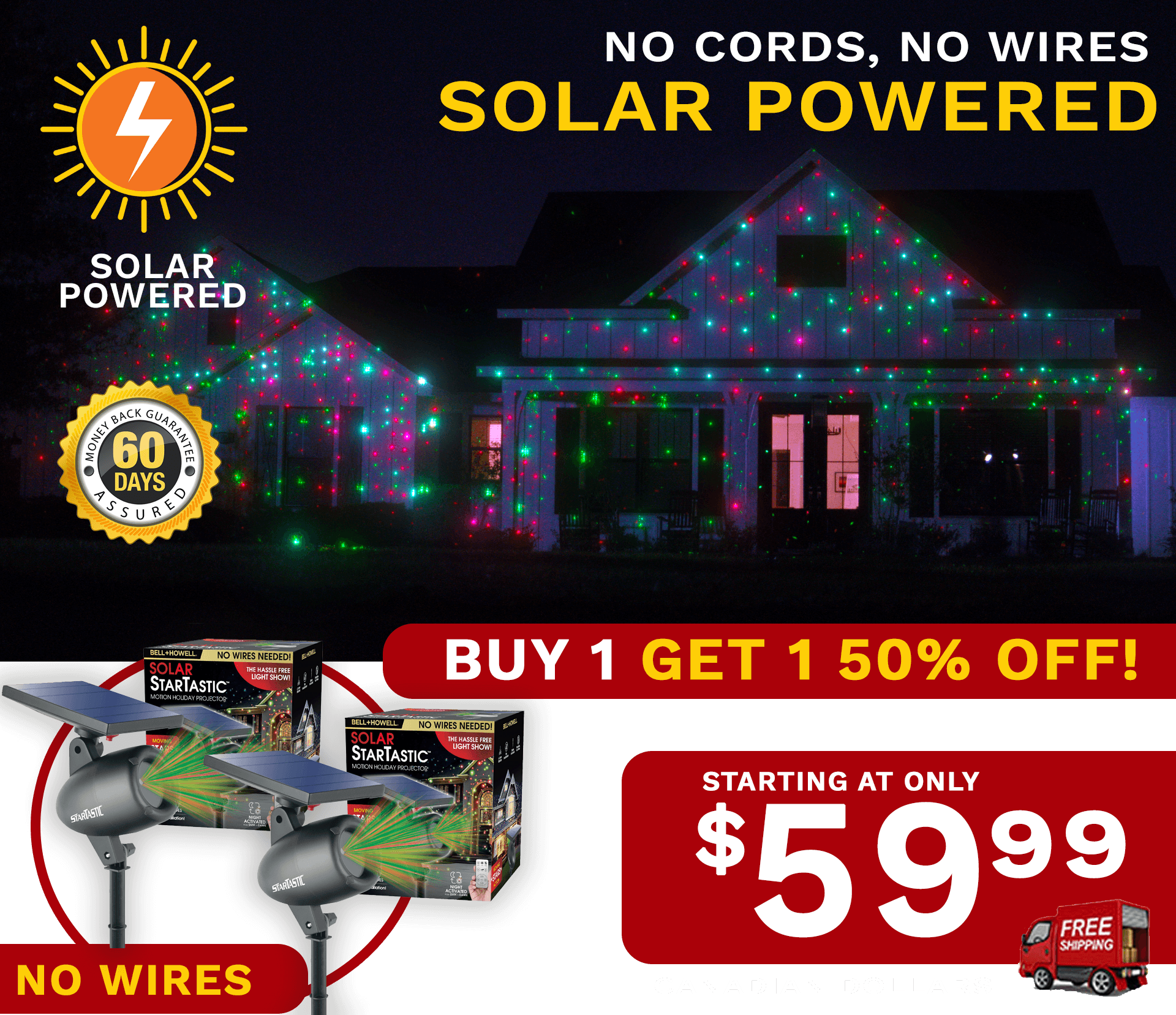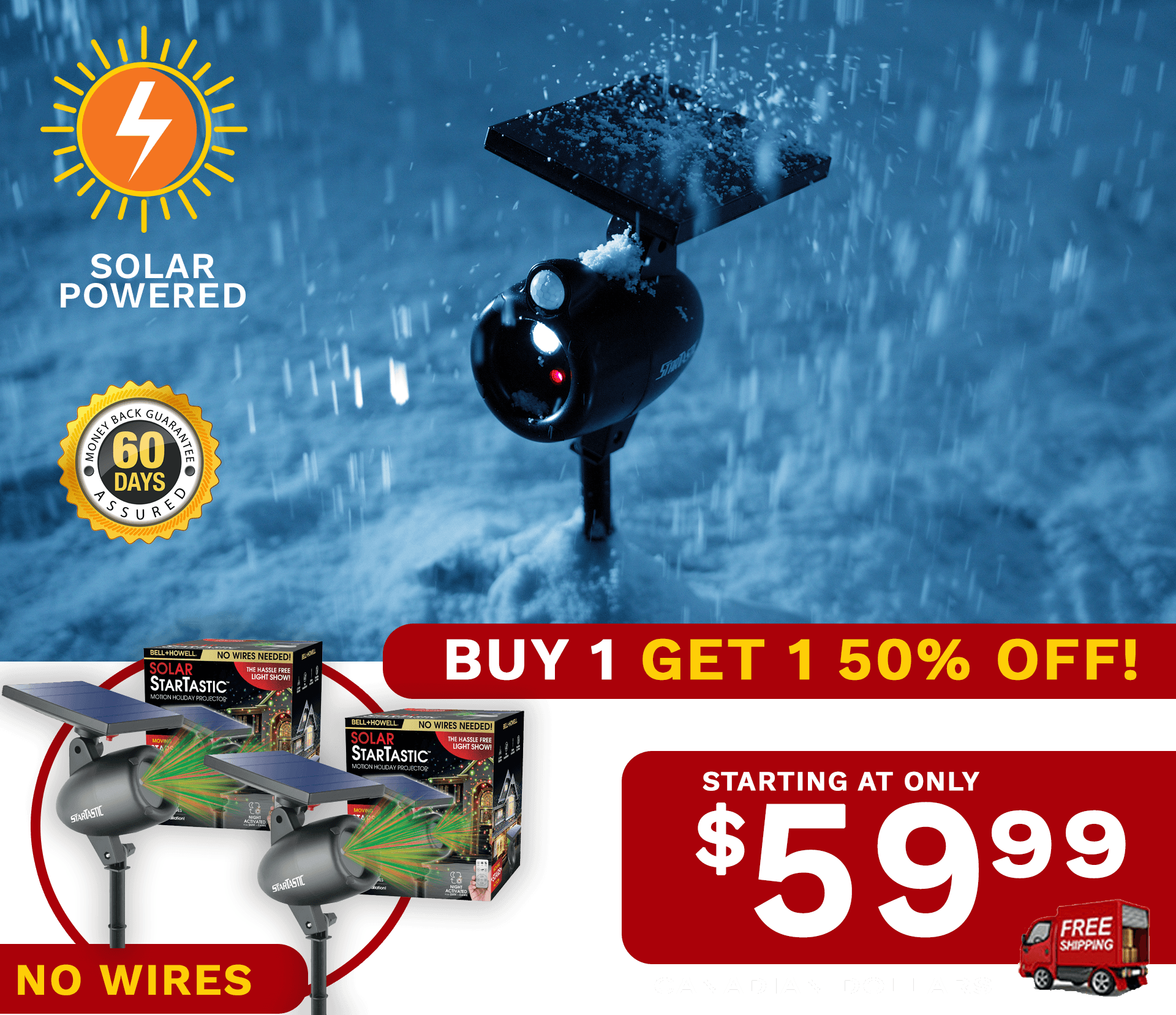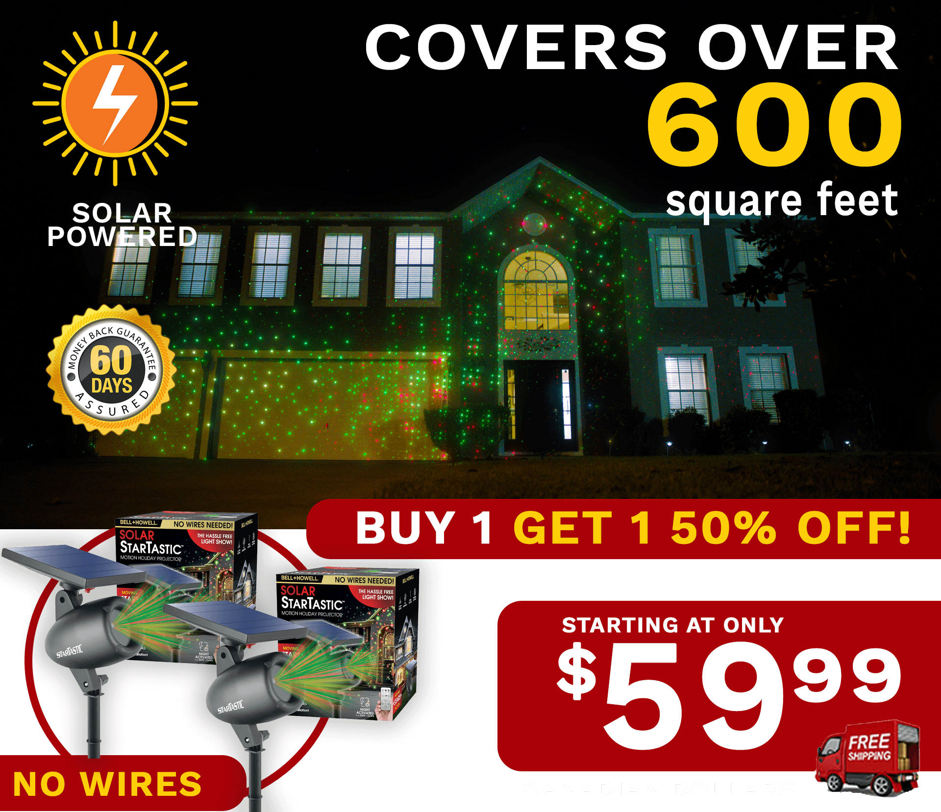 Built to last, it’s solar-powered and weather-resistant. It requires no wires or power cords and is suitable for use throughout the year. With the ability to project up to 600 square feet, the projector delivers a dazzling 3-D holographic starlight effect using multiple laser light modes.